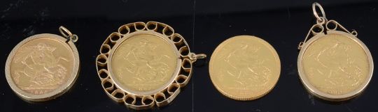 Four Victoria gold full sovereigns, three mounted as pendants