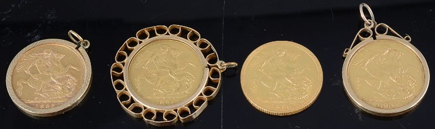 the sovereigns dated 1889, 1891, 1893 and 1895, the three set as pendants in removable 9ct gold mounts one with scroll surround, (4)