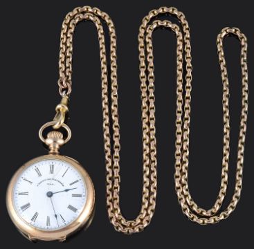 An American 10k gold top wind open faced ladies Waltham pocket watch and a Victorian fancy link rose coloured watch chain