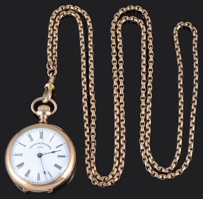 the circular white dial with black Roman numerals, seconds markers and blue steel hands signed American Waltham U.S.A., on a fancy link rose coloured chain with attached 18ct gold clip, (2)