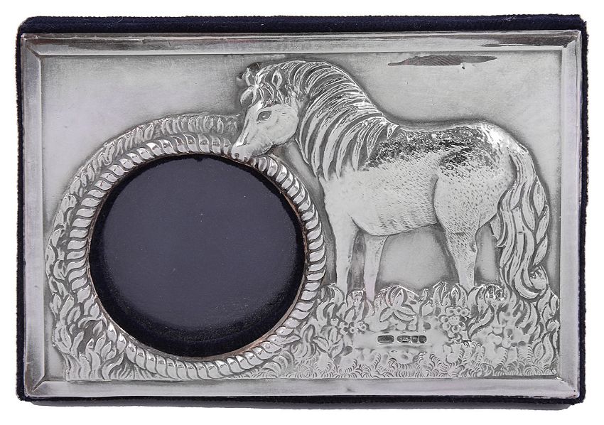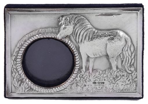 circular aperture with a rope border, the surround embossed with a horse, blue velvet back with easel support
