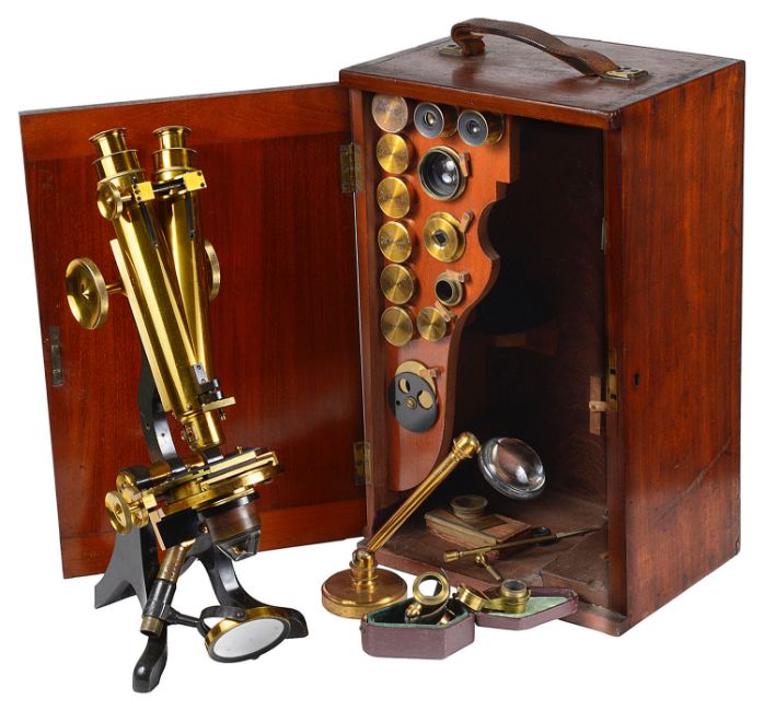 A late 19th century Henry Crouch lacquered brass binocular microscope