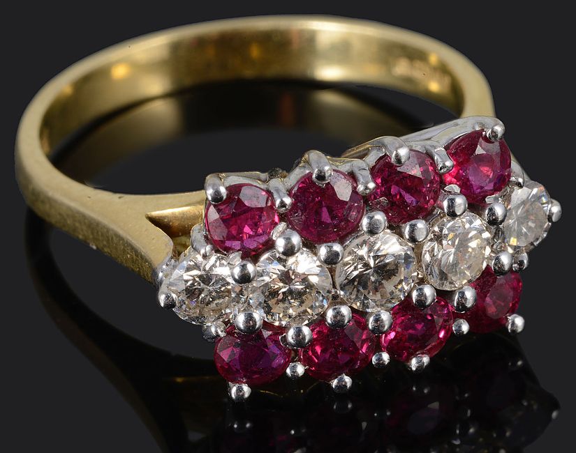 having central row of five diamonds flanked by four rubies to either side, marked for T.O'D Jewels, mount marked for 18ct gold