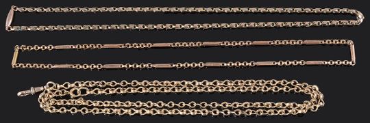 having double row and end clip, chain tests gold, clip marked 9ct, a fancy bar link 9ct gold chain and another fancy link chain (3)