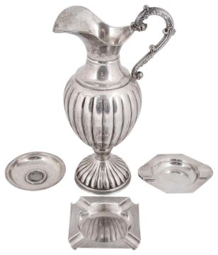 the ewer, marked for Madrid by Montejo, of fluted ovoid form on a conforming weighted pedestal foot with acanthus leaf scroll handle, together with a Maltese silver coin dish, an Art Deco hexagonal ashtray, Sheffield, 1946 by James Dixon & Sons and an engine turned square ashtray, Sheffield, 1947 by Viner's Ltd, (4)