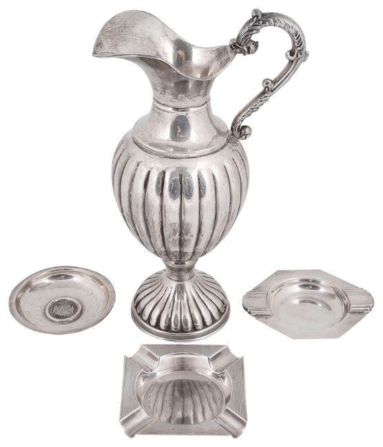 A 20th century Spanish .925 silver ewer together with a Maltese .917 silver coin dish and two George VI Art Deco silver ashtrays
