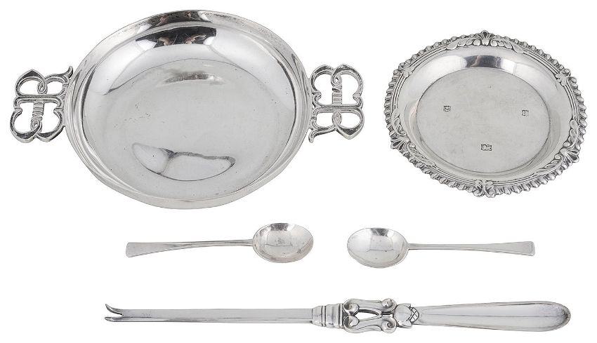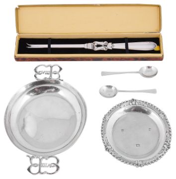 An Edward VIII silver twin handled wine taster, a Georg Jensen silver Acorn pattern lobster pick and other items