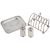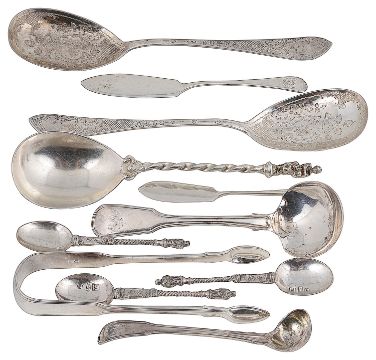Condition: Overall in fair age condition commensurate with age. Gilding to bowl of smaller sauce ladle worn. Pepper pots leaning with dings, with pushed finials and foot rim. Tips of butter knives slightly pushed. Gilt on Victoria apostle spoon heavily rubbed.