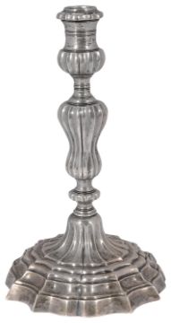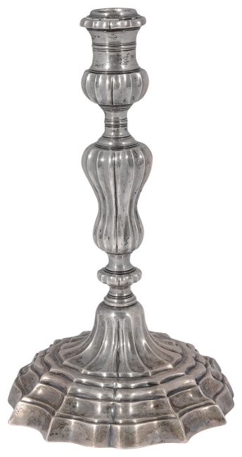 on a raised shaped circular spreading base with a fluted inverted baluster knop stem and fluted knopped socket, initialled to to foot rim G A V