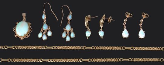 the pendant with oval opal set in yellow metal filigree mount, (tests for gold) and suspended from an 18ct gold figaro link chain, together with a pair of delicate chandelier opal set drop earrings, (test for gold), another pair of tear shaped opal drop earrings and a pair of scroll opal set drop earrings, earring mounts (test for gold) (4)