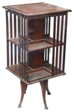 An Edwardian mahogany revolving two tier bookcasethe square top with moulded edge above slatted sides, raised on four legs with cast ion feet height 101 cm., width 48 cm., depth 48 cm. Condition: Good condition Collection is required by 4pm on Friday 29th November from the auction venue at Farleigh Golf Club.