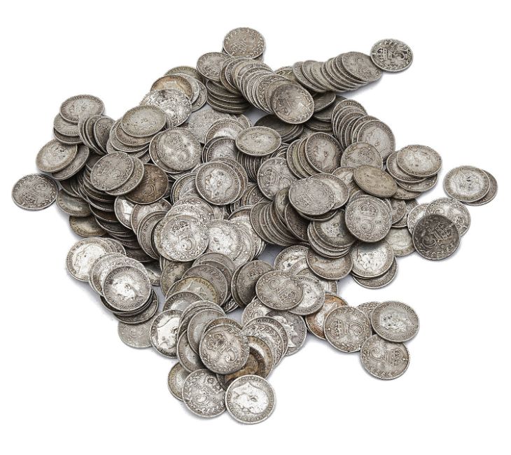 total weight pre 1920 threepences and silver coins approx. 26.64 ozt. total weight pre 1947 ozt. approx. 15.06 ozt.