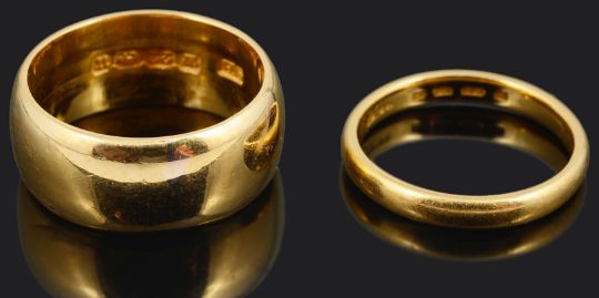 the wide band marked for Birmingham 1894, maker's initials S.H., together with a narrow 22ct gold wedding band (2)