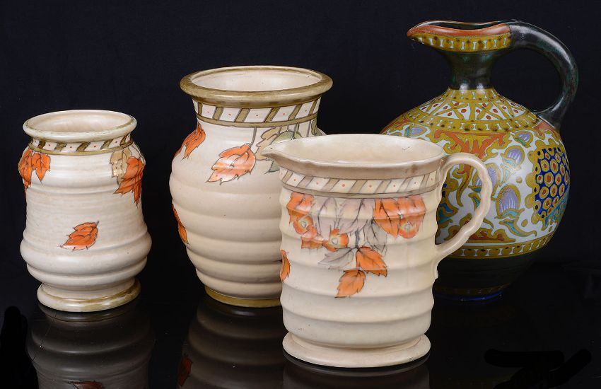 Three pieces of Art Deco Crown Ducal Charlotte Rhead pottery and others, each painted in the Autumn Leaves pattern, number 4921, comprising a lobed high shouldered vase, a ribbed baluster vase and an oval section jug, various printed, impressed, tubelined and painted marks to bases, together with an Art Nouveau Gouda 'Berna' jug, together with