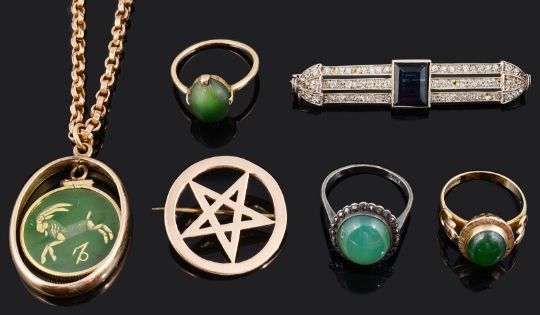 comprising a 14K gold mounted jade ring; another yellow metal ring (tests gold) with green hard stone; a marcasite and green hard stone ring; a 9ct gold Star of David Brooch; an Art Deco silver mounted paste bar brooch, and a green hard stone pendant engraved with Capricorn zodiacal sign with a 9ct gold belcher chain (6)