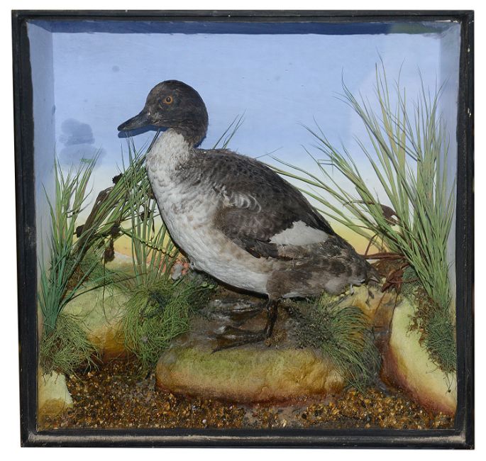 Taxidermy: A late 19th century duckin a naturalistic setting with faux rock work and grasses, painted backboard and sides, glazed fronted ebonised caseheight 46 cm., width 46.5 cm., depth 17.5 cm. Condition: Good conditionPlease note we would be grateful if collection can be made by 4pm on Friday 29th November from the auction venue at Farleigh Golf Club.