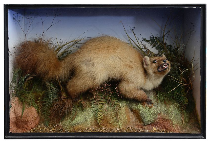 Taxidermy: A Victorian pine marten by James Gardnerin a naturalistic setting, painted backboard and sides in a glazed fronted case, bears paper label J. Gardner Naturalist to the Royal Family 426 Oxford St London height 40.7 cm., width 61 cm., depth 20.5 cm.Condition: Some light moth damagePlease note we would be grateful if collection can be made by 4pm on Friday 29th November from the auction venue at Farleigh Golf Club.