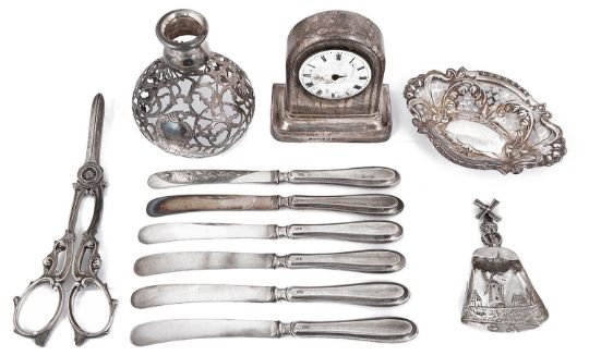 comprising a George V arched desk cock, Birmingham, 1913 by Samuel M Levi, linear engine turned decoration on moulded plinth base, having associated pocket watch movement, signed John Gaskin, Dublin, 1823, a Dutch tea caddy spoon embossed with windmills, makers mark only, a pierced and embossed pin dish, an American .900 scent bottle cage by William Wise & Son, a set of six silver handled tea knives and a pair of Victorian plated grape shears (qty)