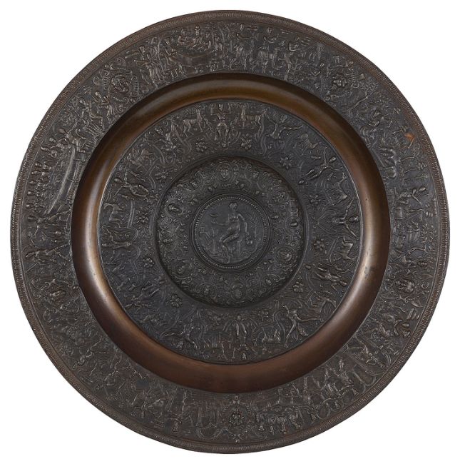 A 19th century Renaissance style bronze patinated relief cast iron circular dish