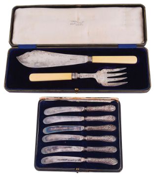 the salts, Birmingham, 1898 by Colen Hewer Cheshire, of fluted pedestal form with a pair of spoons in a fitted case, the servers, Sheffield, 1914 by Harrison Brothers in a fitted case, together with a pair of George IV Kings pattern sugar tongs, London, 1828, makers mark WT, an American sterling cake knife, a pair of engine turned rectangular napkin rings, initialled, a cased set of six embossed silver handled butter knives, etc., (qty)
