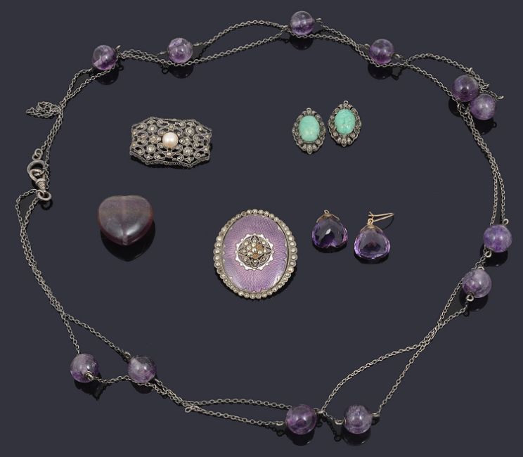 together with a pair of heart shaped facetted ear drops, yellow metal fittings tests for gold, a guilloche enamel and marcasite brooch, a silver, marcasite and half cultured pearl set panel brooch, a large bluejohn heart shaped bead/pendant and two other items (qty)