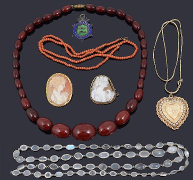 the hinged opening locket testing for gold and set with a single diamond and having cultured pearl border, inscription to reverse dated 10-21-61, together with a silver mounted moonstone set necklace, a graduated cherry amber bead necklace, a single row small coral bead necklace a.f., a 9ct gold mounted carved shell cameo portrait brooch another cameo brooch a.f. and a silver and enamel fob (7)