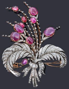 having ribbon tied diamond set fern leaves and en tremblant diamond and cabochon ruby set flowering stems, mount tests for gold and silver