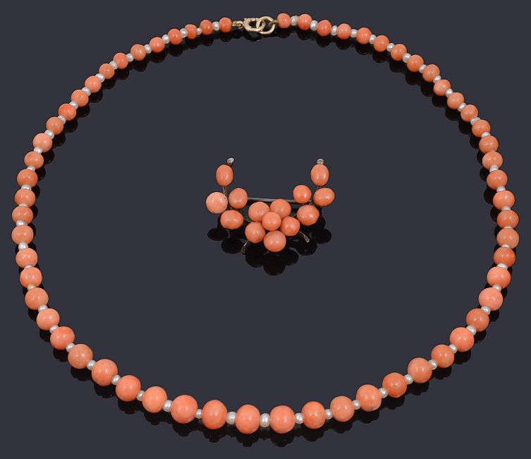 the wire mounted brooch stamped .800 and AF monogram to reverse, the single row necklace having graduated coral beads spaced with seed pearls, 9ct gold fastening (2)