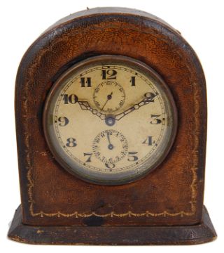 Condition: Some scuffing and slight chips to leather. Small tear to leather on the front. Movement winds, ticks and runs at time of cataloguing at time of cataloguing. However no guarantee can be offered as to the full working order of this clock.