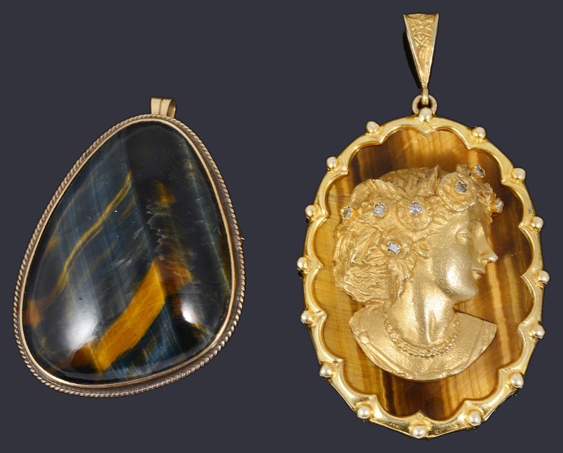 the yellow metal portrait cameo of a woman with diamond set hair, testing for gold, mounted on polished tiger's eye and set within a scroll pendant mount, tests for gold, together with a large hardstone set pendant brooch, 9ct gold mount (2)