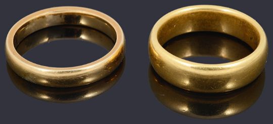 A 22ct gold wedding band and an 18ct gold wedding band22ct approx weight 7.4g., and 18ct gold weight approx 3.8g, sizes J/K, L/MCondition: Both in good condition