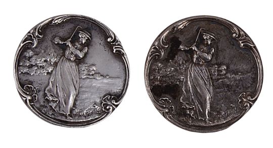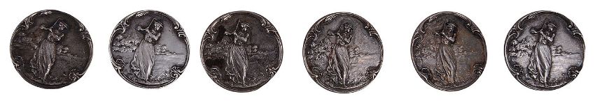 cast with a design of a lady golfer within an Art Nouveau scroll border, in an associated leather box (6)