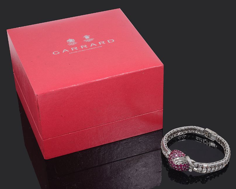 possibly by Garrard, having central ruby and baguette diamond set tied cluster and with graduating brilliant and baguette diamond bracelet tapering to either side, diamond set invisible push clasp fastening, unmarked, associated pink Garrard bracelet box, white metal mount testing for gold