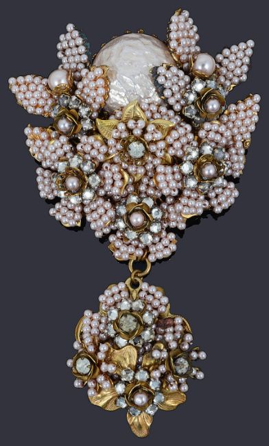 formed as champagne pink faux pearl leaves with diamante and pearl floral clusters around a large faux pink baroque pearl and with similar drop below, the brooch with delicate gilt foliate detail, gilt filigree back with Stanley Hagler N.Y.C. oval signature plaque to reverse.