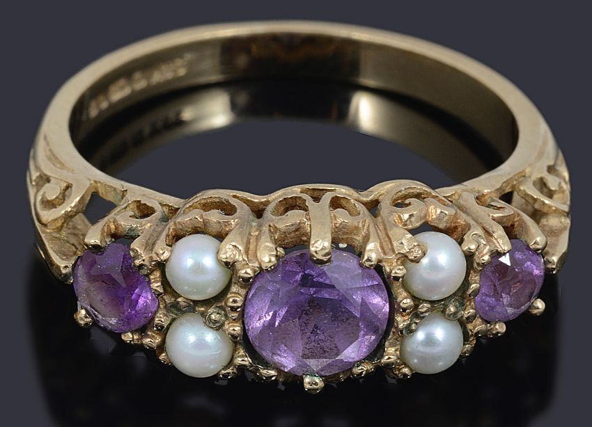 the gypsy ring marked for 9ct gold, together with a 9ct gold contemporary, amethyst and small cultured pearl half hoop ring, 9ct gold mount (2)
