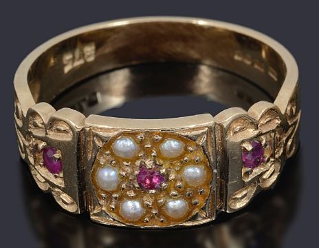 A Victorian style ruby and seed pearl set gypsy ring and another