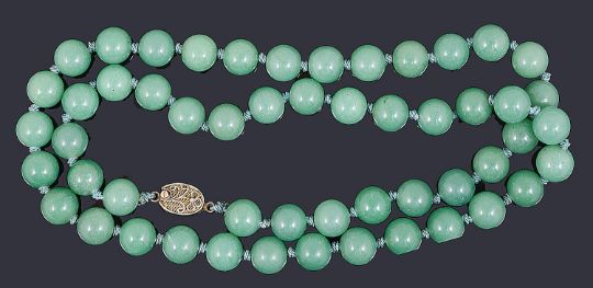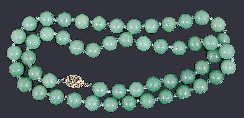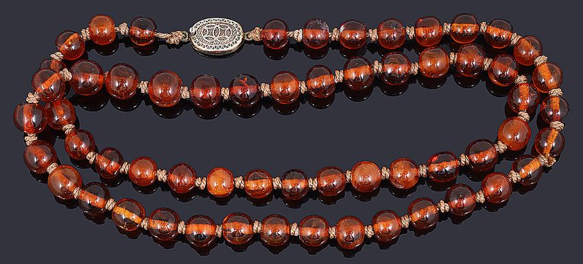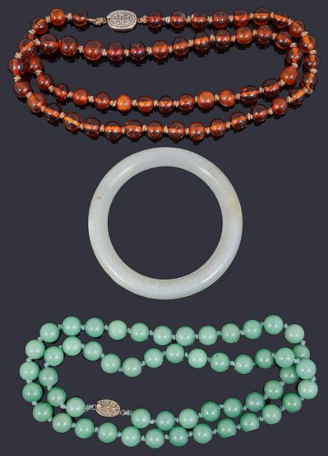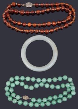 together with a clear amber bead necklace with silver gilt filigree clasp and a string of green hardstone beads with silver filigree clasp (3)