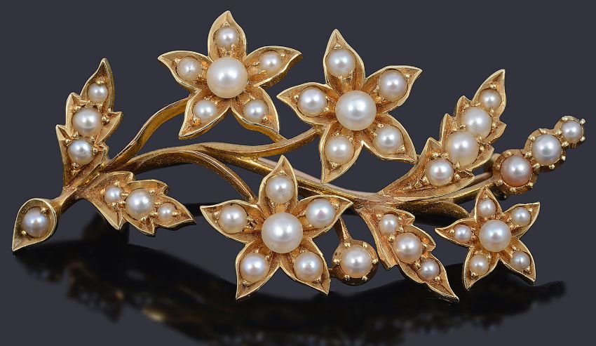 Condition: Overall good, detail crisp, pearls in good order, pearls untested, possible historic competent fastening pin replacement
