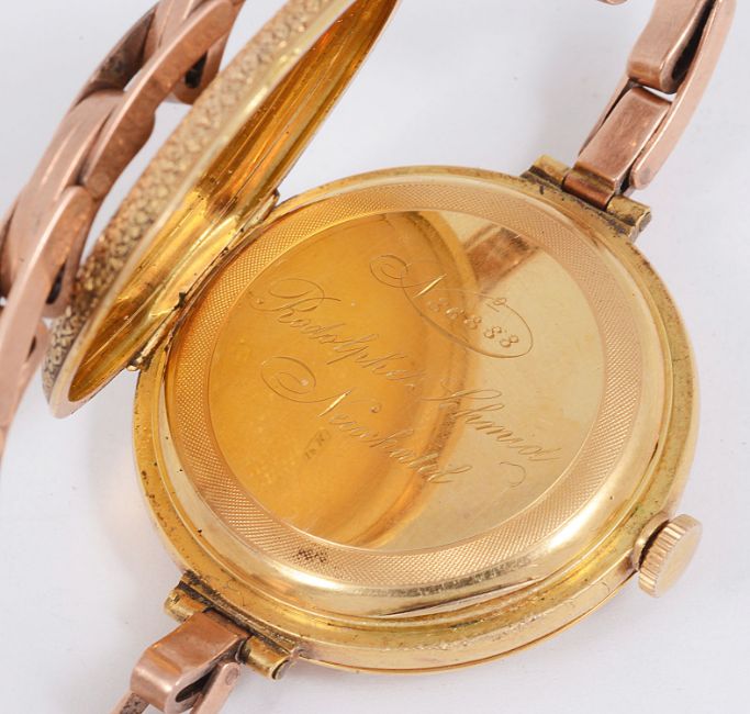 having foliate engraved case and black enamel chapter ring to front cover, the white enamel dial with black Roman numerals and minute track, the dust cover engraved No 86888 Rodolphe Schmidt Neuchatel, on a 9ct rose gold Britannic expandable bracelet