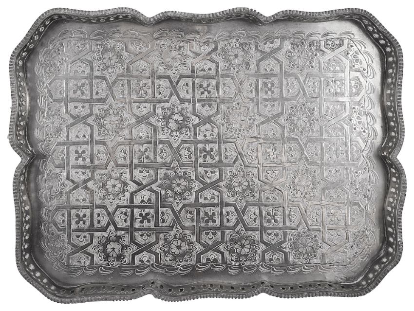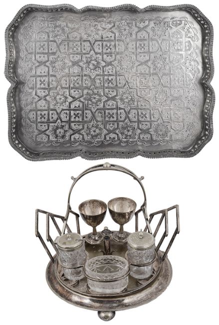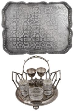 An Edwardian silver plated revolving breakfast cruet stand and an Islamic silver plated rectangular galleried tray