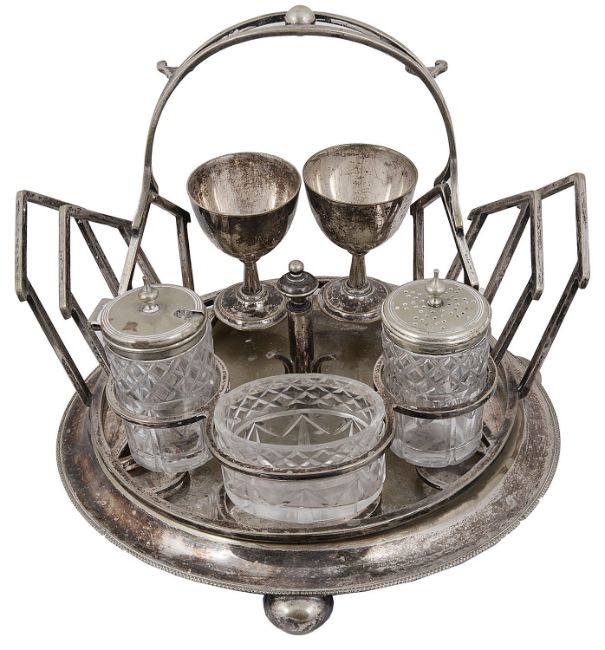 Condition: First overall silver plate is quite heavily rubbed. Breakfast cruet stand without egg spoons