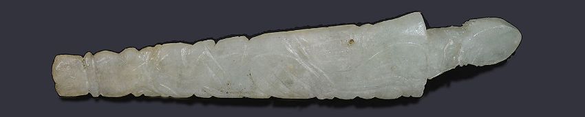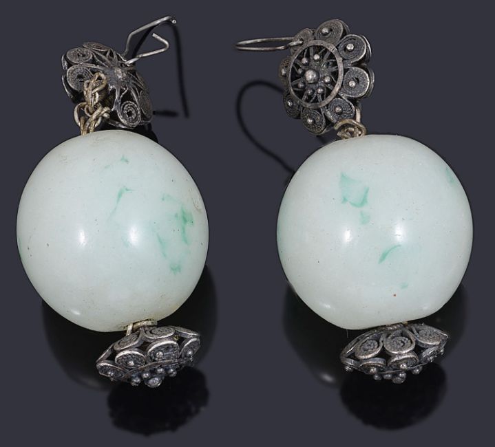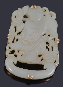 the pierced and carved figural panel in yellow metal brooch mount, tests for gold, together with a pair of large filigree hard stone orb earrings, test for silver and a part hard stone belt hook, a.f. (3)