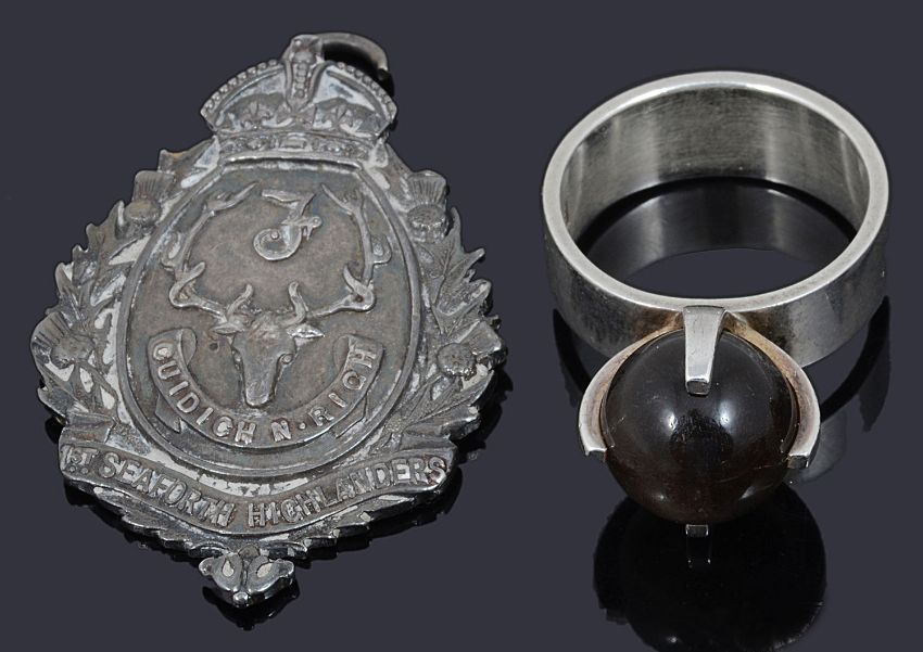 original box, together with a small collection of silver jewellery including a Victorian horseshoe and flower brooch, a silver St. Seaforth Highlanders shield fob, a coral and marcasite ring, another ring and a fleur-de-lys stick pin (qty)