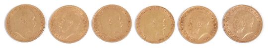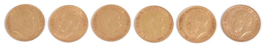 the three Edward VII half sovereigns, 1906, 1908 and 1910, gold coins 0.916, Obverse: King Edward VII bare head right, Edwardus D:G:BRITT:OMN:REX F.D. IND:IMP; Reverse: St George slaying the dragon right, the three George V gold half sovereigns, 1911, 1913 and 1914, gold coins 0.916, Obverse: King George V bare head left, GEORGIVS V D.G. BRITT:OMN:REX F.D. IND:IMP; Reverse: St George slaying the dragon right, (6)