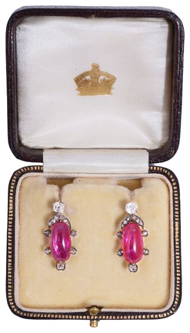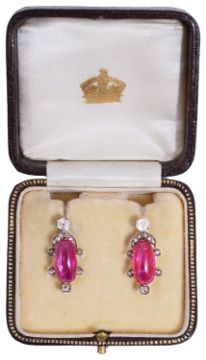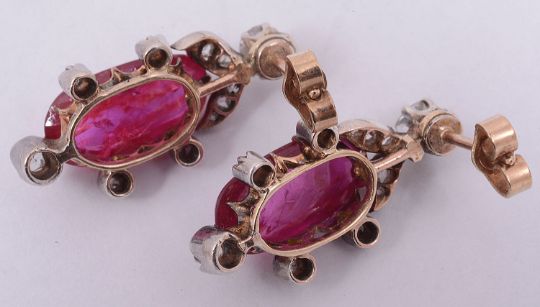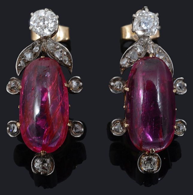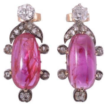 An attractive pair of 19th Century natural Burmese ruby and diamond earringsthe elongated oval cabochon rubies within a delicate foliate rose diamond set mount below with single diamond set top, associated leather box rubies approx. 13.8 x 5.61 x 3.81mm., and 6.98 x 12.94 x 2.67mm., approx. dropCondition: Overall good, possible historic alteration to fittingsThe earrings were sent to a London gem laboratory to confirm that the rubies had not been heat treated. Upon examination the laboratory stated in their opinion the rubies originate from Burma and have not been heat treated. Please note that this was a verbal opinion and that there is no accompanying gem certificate stating such sold with the earrings.
