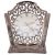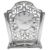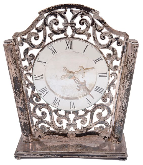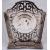the circular silver dial with raised chapter ring and black enamel numerals framed by an arched fan shaped pierced and engraved scroll surround having upright supports, on a rectangular plinth base, 8 day movement