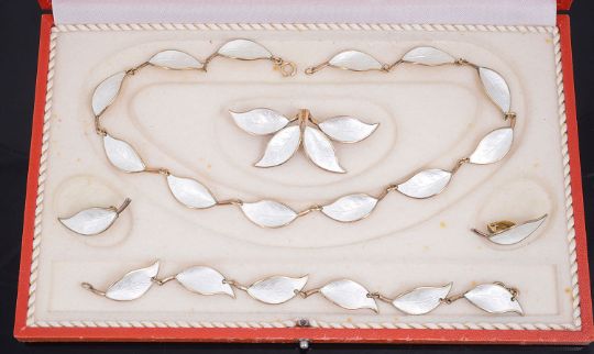 A suite of Norwegian David Anderson enamel leaf jewellery