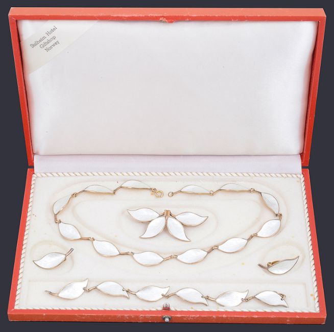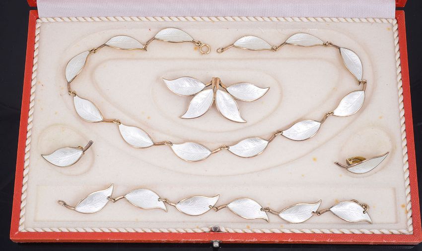 comprising necklace, bracelet, brooch and ear clips, each of cream guillioche enamel on silver gilt mounts, each piece fully marked for David Anderson, original box from Stalheim Hotel Giftshop, Norway