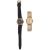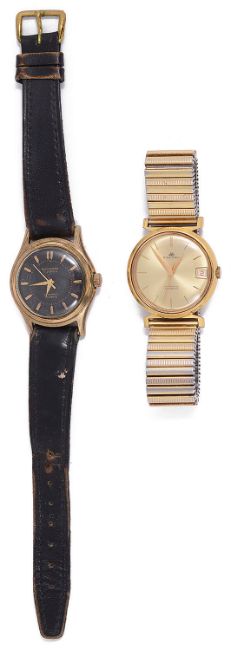 first having gold dial, hour batons and calendar on a gilt expandable bracelet, second having black dial and gold batons on a leather bracelet, (2)