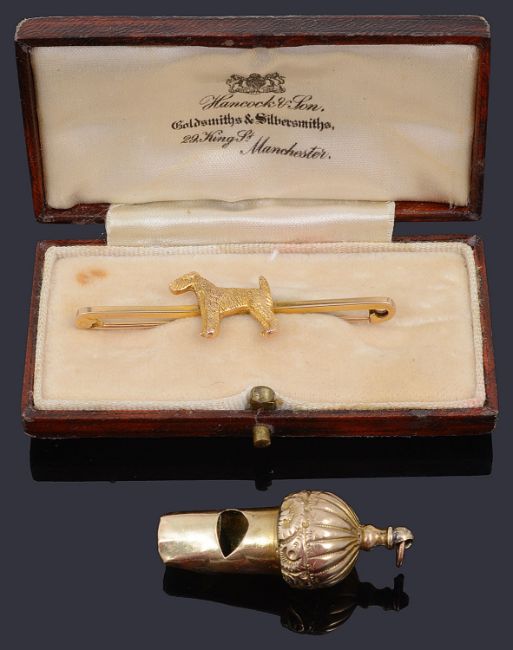the dog mounted on a pin marked 9ct contained within a fitted Goldsmiths & Silversmiths box, together with a yellow metal (unmarked) dog whistle (2)